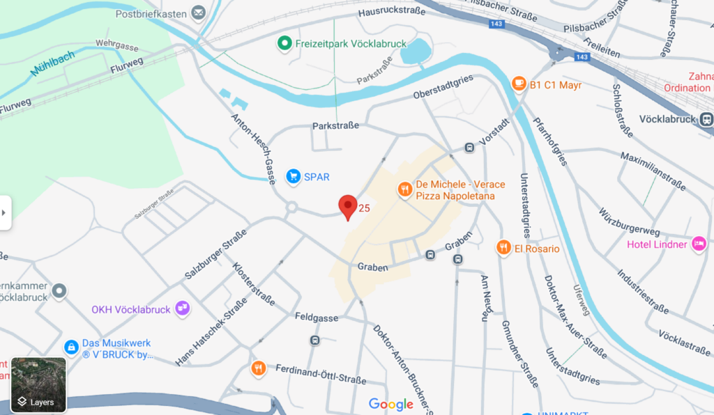 Vom Bahnhof Vöcklabruck beträgt der Fußweg ca. 13-15 Minuten.